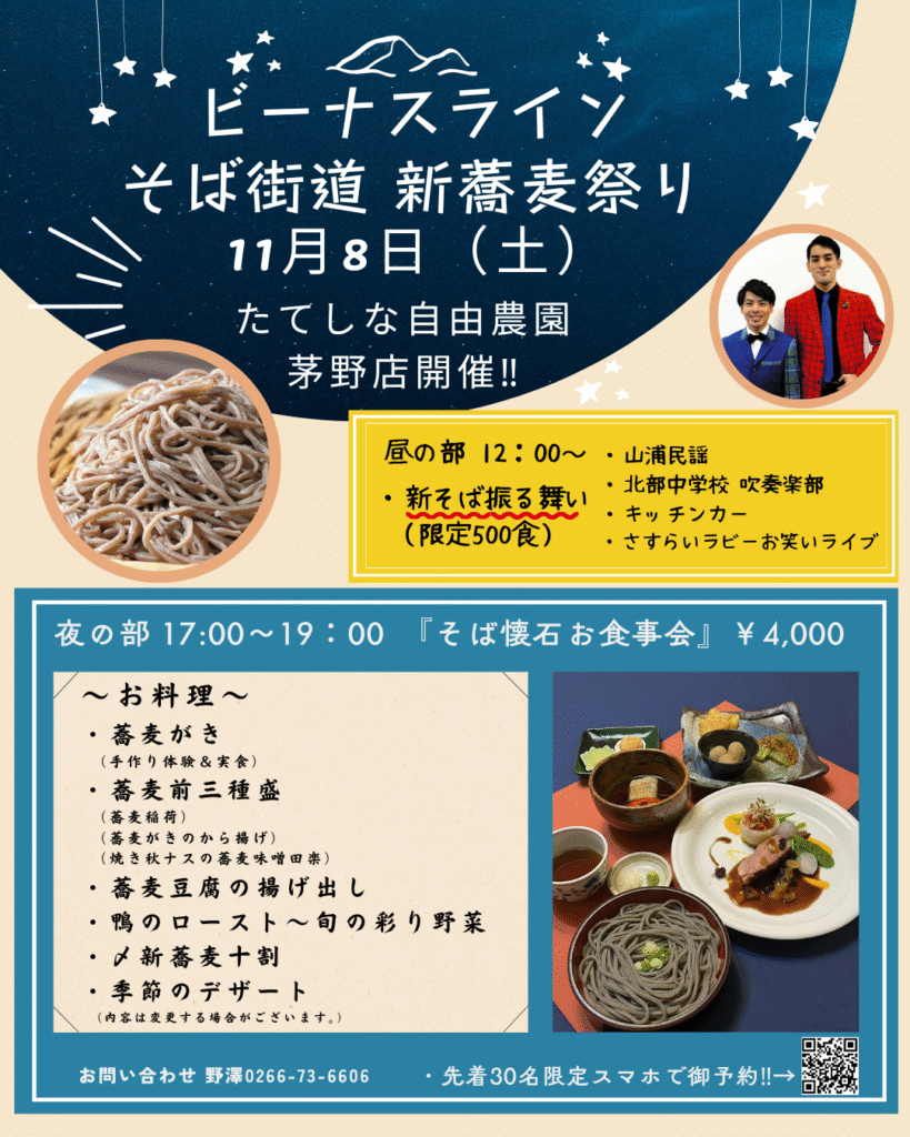 昼の部では、新そばを先着500名様に無料配布。爽やかな秋空の下、香り豊かなそばを味わってください。